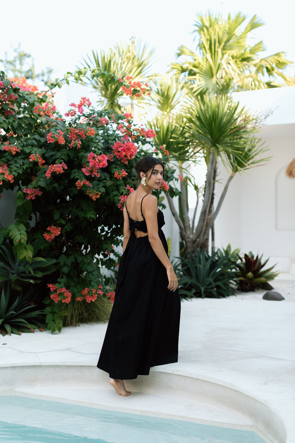 Defined by slim straps and a bold waist reveal, this dress sculpts the bodice before releasing into a flowing skirt. The contrast of structure and softness creates a silhouette that is striking yet effortless in movement.