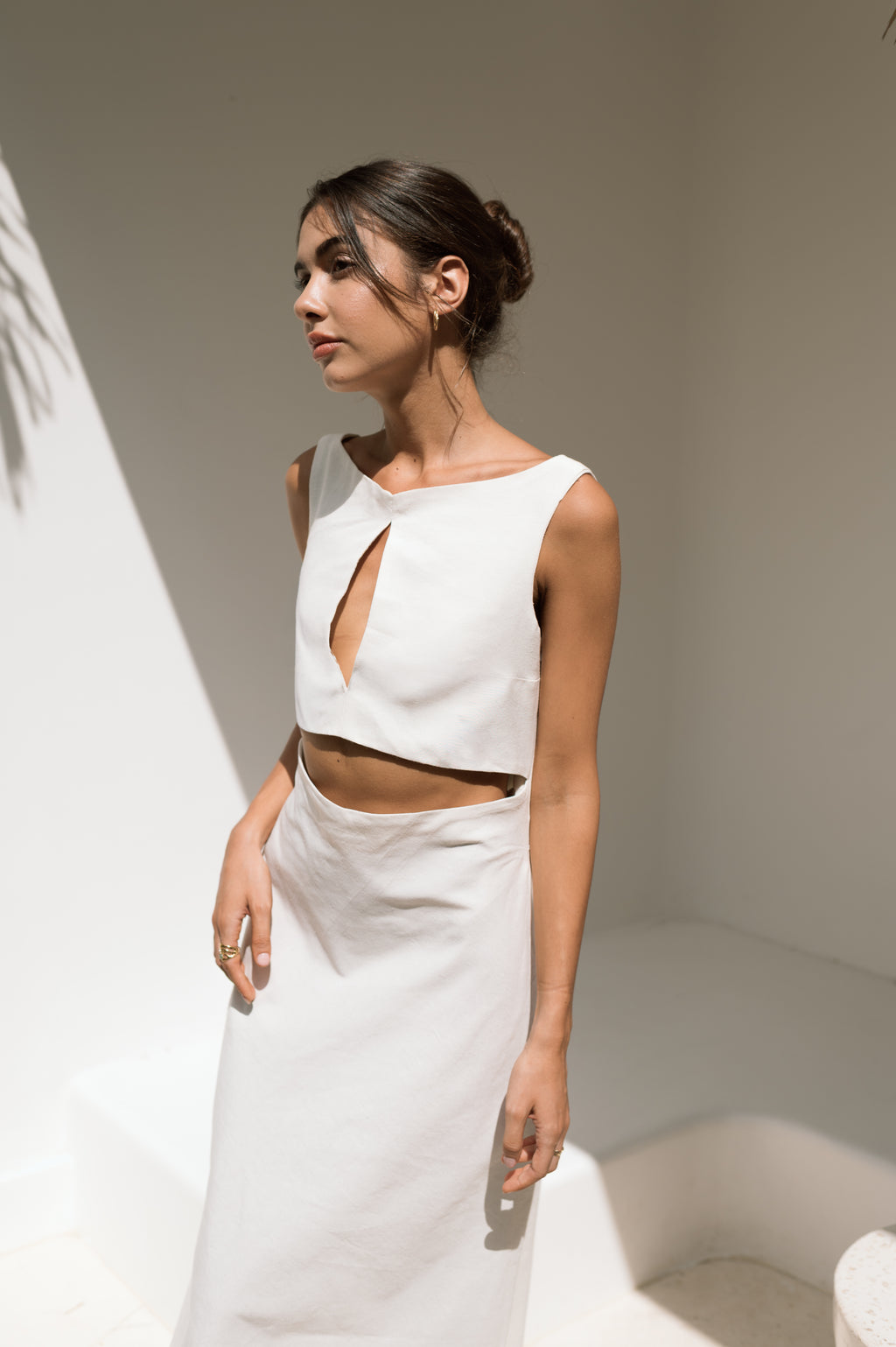 A sleeveless full-length dress that embodies modern minimalism with subtle sensuality. A sculpted front cutout defines the waist, flowing into a graceful skirt with effortless movement. Timeless yet contemporary, it transitions seamlessly from sunlit afternoons to refined evening elegance.