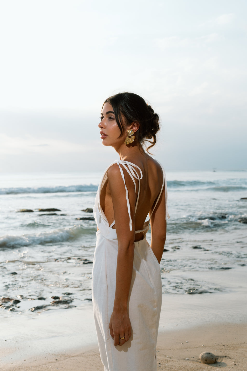 A striking silhouette where fabric gathers at the bust before opening into a bold waist cut. The design frames the figure with precision, while the skirt falls in clean, elongated lines—an interplay of confidence, ease, and refined drama.